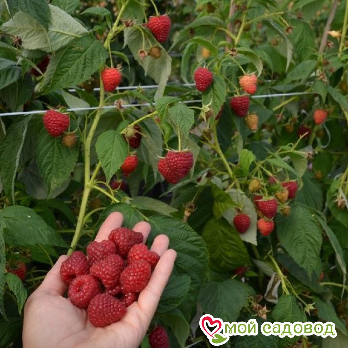 Читать далееМалина относится к ремонтантным сортам и плодоносит 2 раза за сезон. Куст у культуры высокий, крепкий и мощный, лоза в длину достигает до 1,6-1,8 м. Боковые побеги кустов в среднем по 70 см. Примечательно то, что ветки могут ломаться под тяжестью ягод, поэтому необходимо продумывать систему держателей или шпалер.